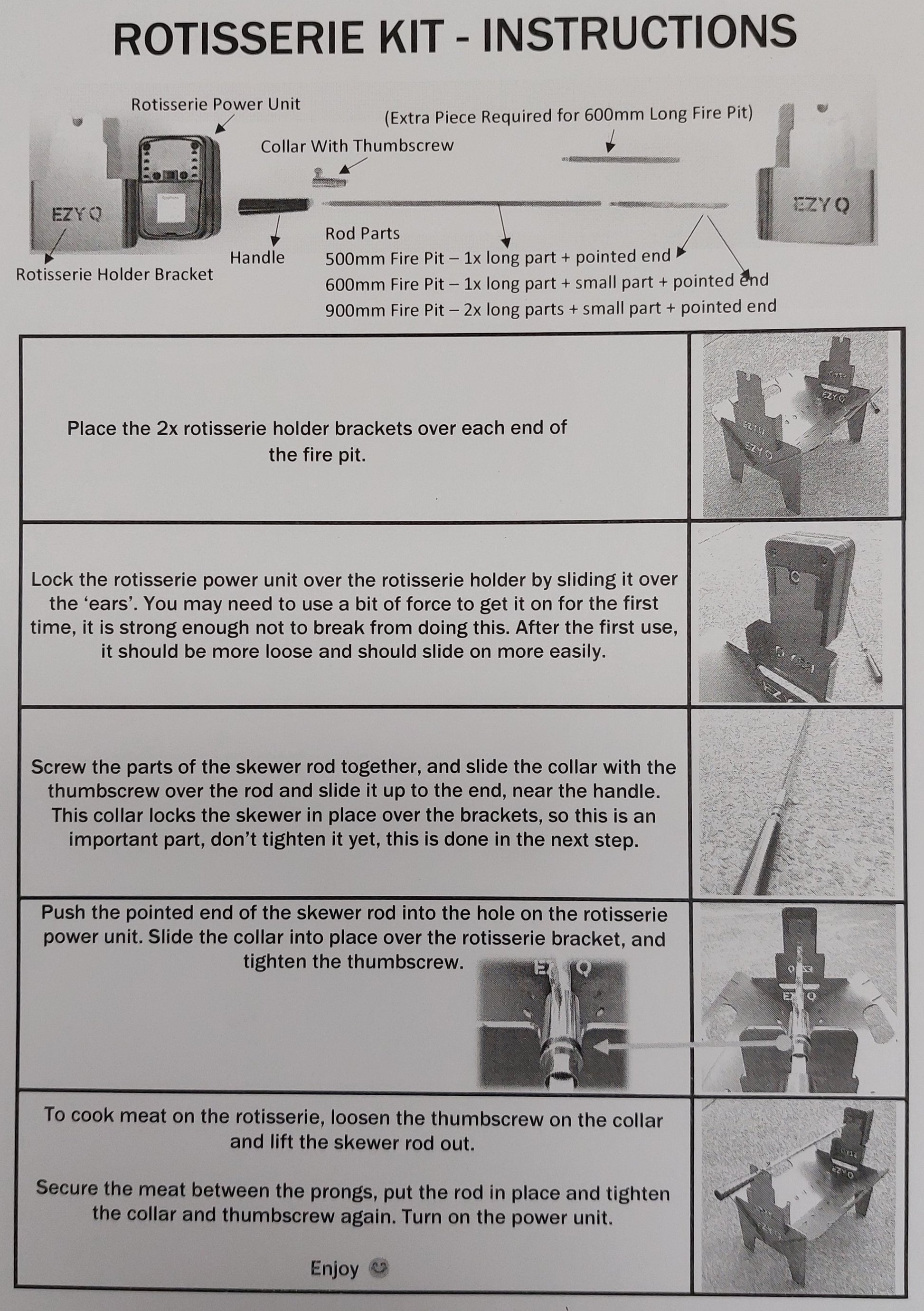 Simply clip the two stainless steel brackets over the ends of your fire pit, then attach your Gasmate rotisserie motor. The rotisserie motor securely slides over our brackets - no need for any screws or equipment.